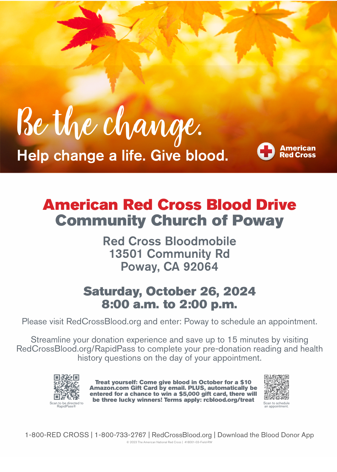 Join us for a Blood Drive in partnership with the American Red Cross on Saturday, October 26th at the Community Church of Poway!